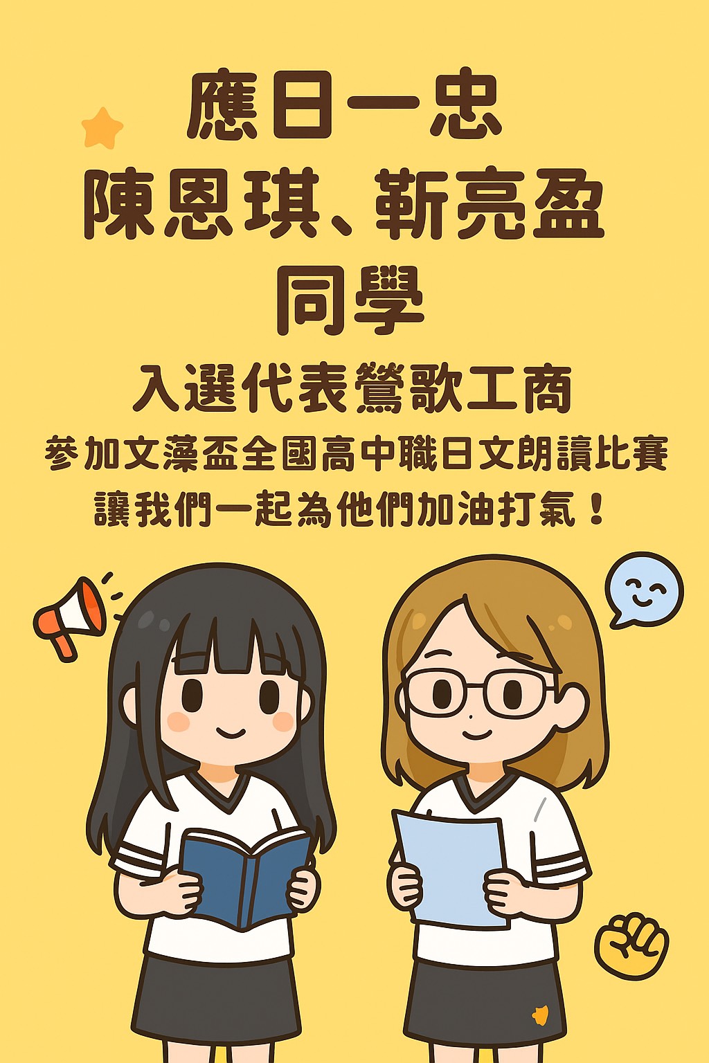 🎉恭喜應日一忠陳恩琪、靳亮盈同學!校內朗讀比賽表現優異🌟成功入選代表鶯歌工商,前進挑戰文藻盃全國高中職日文朗讀比賽!🇯🇵📖✨讓我們一起為兩位同學加油打氣,期待她們在全國舞台上大放異彩!💪🔥