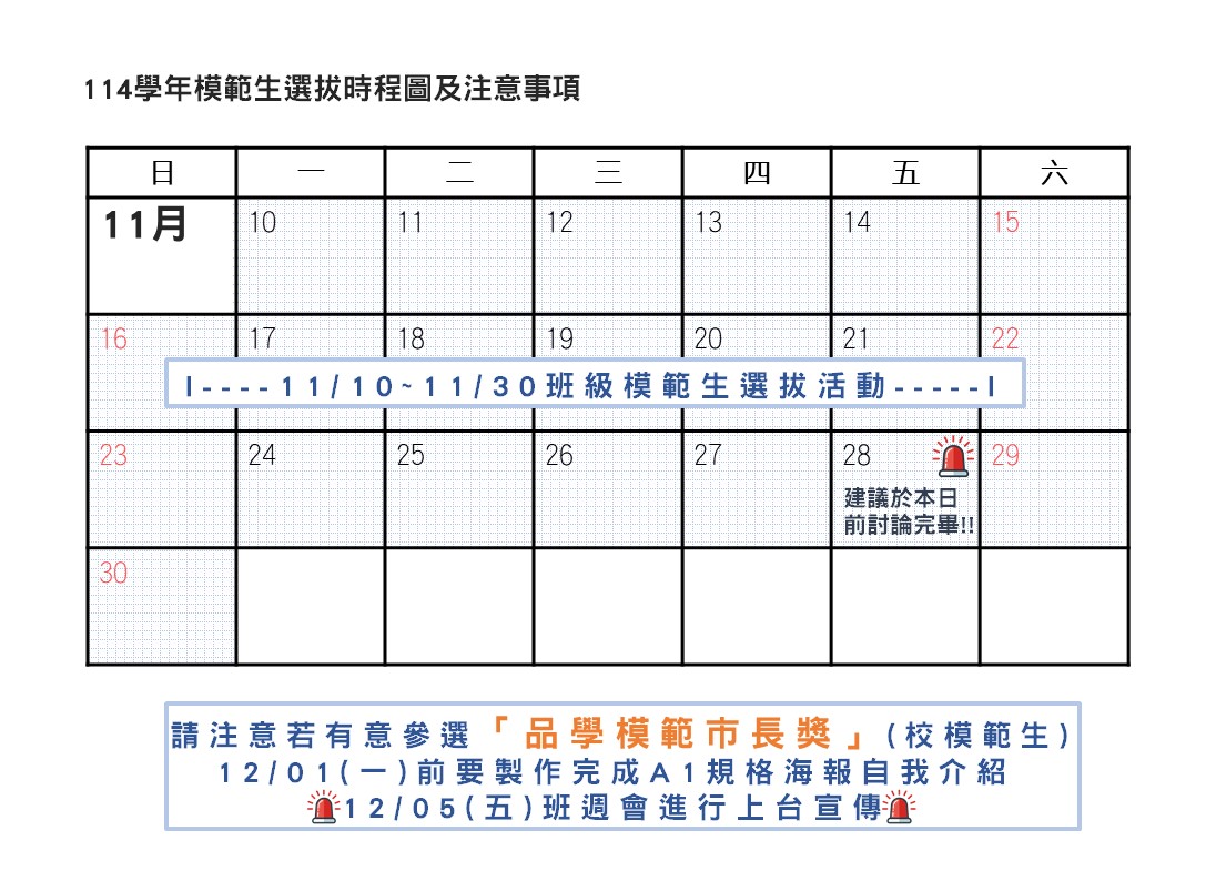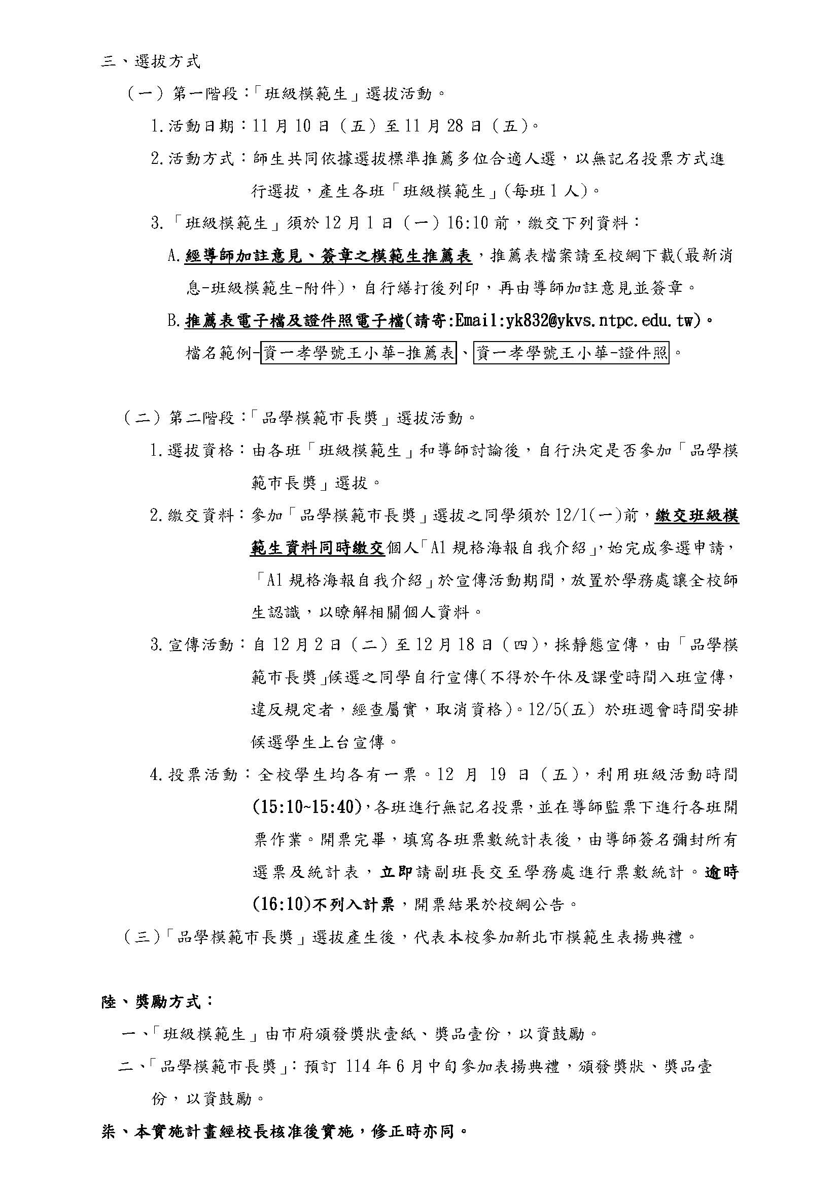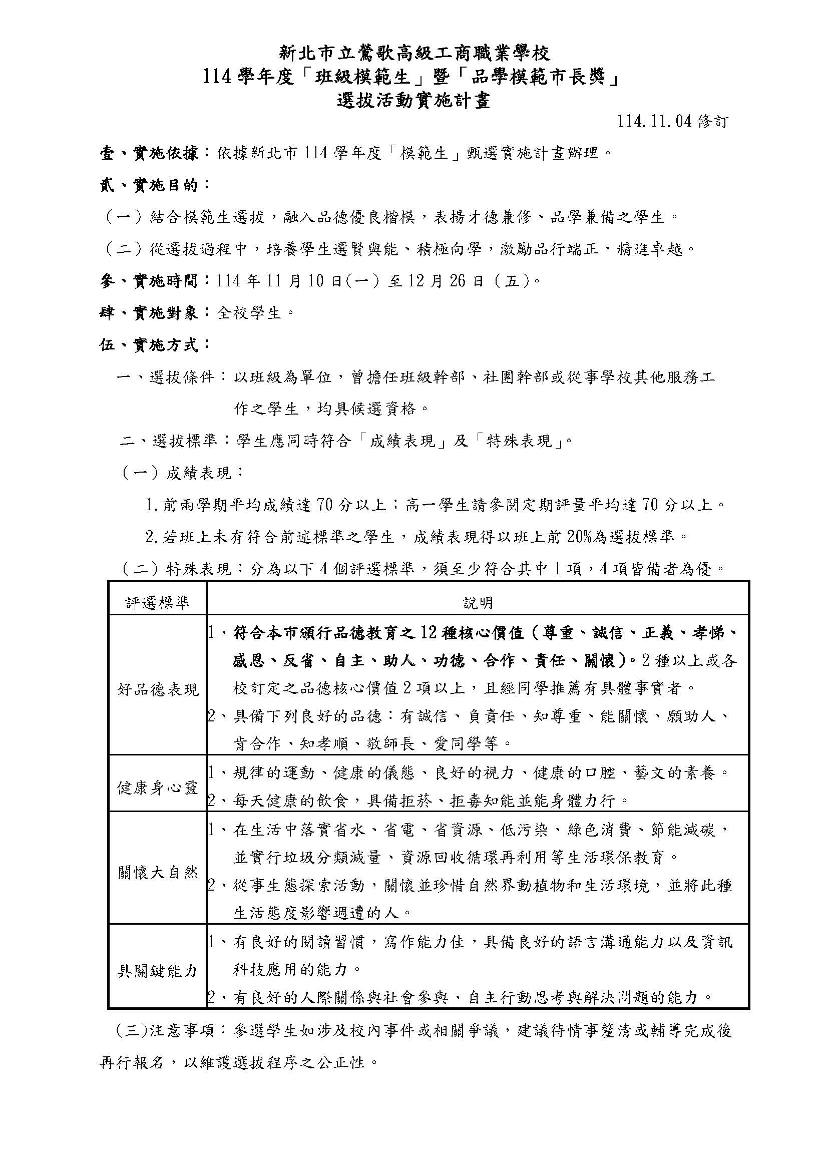 🙋👑🙋♂️新北市鶯歌工商114學年度「班級模範生」暨「品學模範市長獎」選拔活動實施計畫