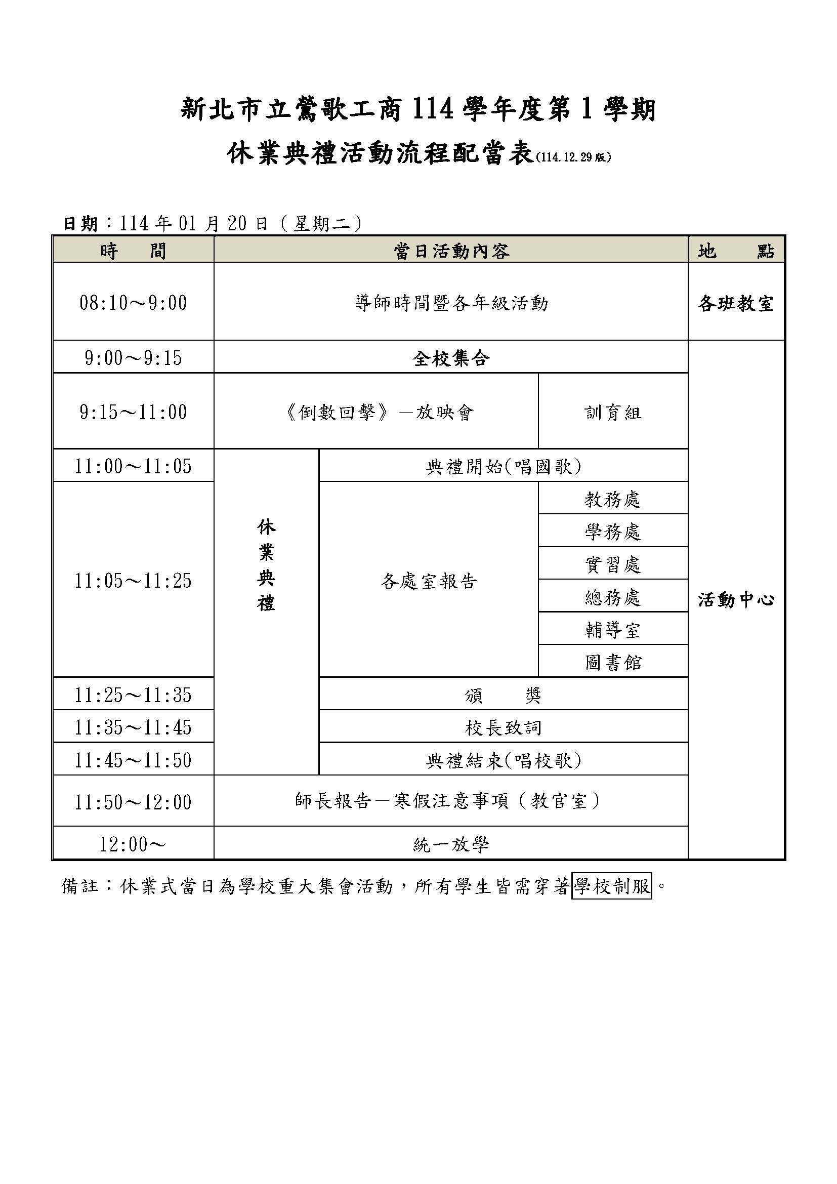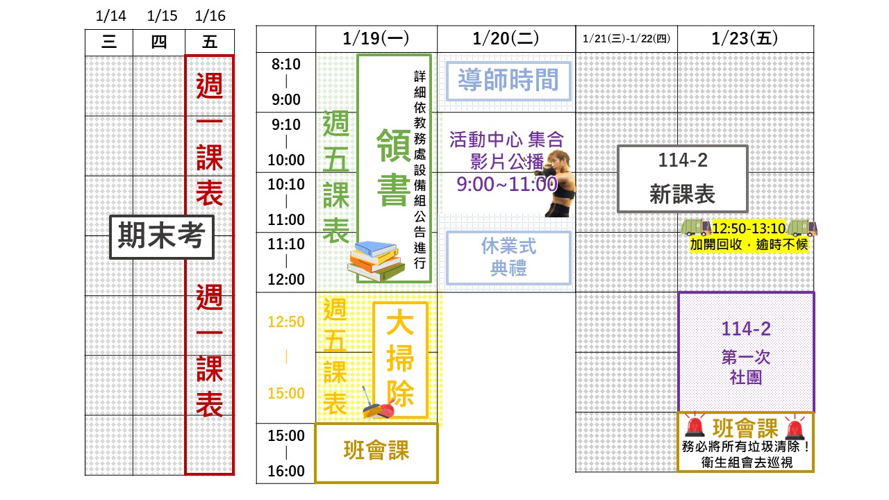 因應本年度寒假原定開學後才遇過年,依教育部規範提前安排補課1/21~1/23為下學期課程。 適逢1/19(一)大學學測,故安排1/16與1/19整日課程對調,以利期末考作業。