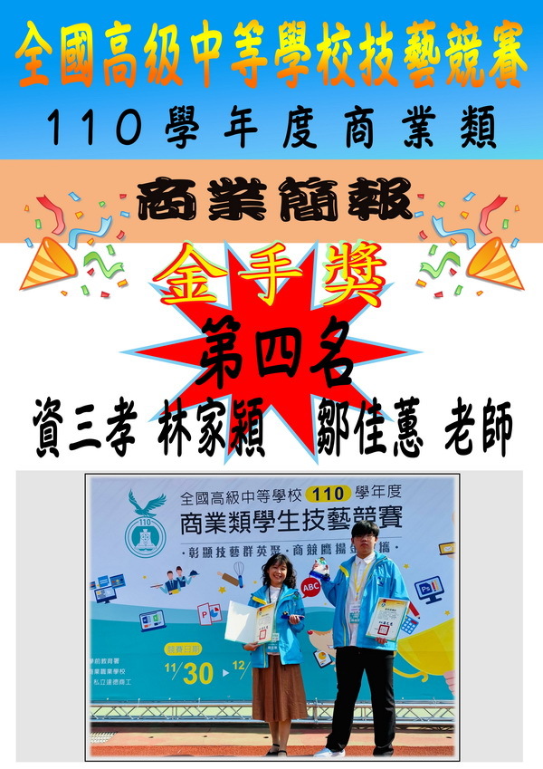 >商業簡報職種:資三孝 林家潁 金手獎全國第四名 (指導教師:鄒佳蕙老師)